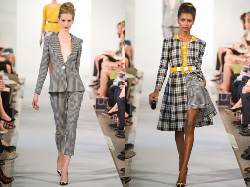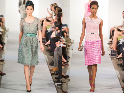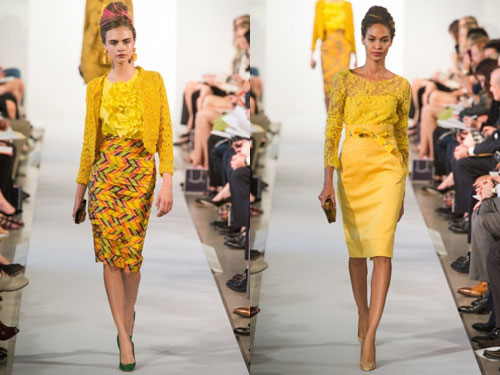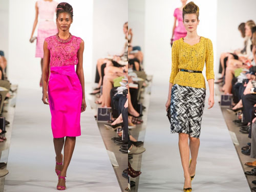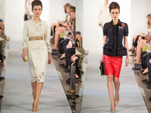 Вместе с Карли Клосс, шедшей по подиуму в красном латексном топе и элегантной юбке-карандаше и блейзере, открытие весенне-летнего модного показа Oscar de la Renta на неделе моды в Нью-Йорке не могло быть лучше! В общем, латекс стал звездой коллекции и прибавил веселья и шика всему показу. Это также прослеживалось в красной юбке-карандаше, а также в ярко-розовом шелковом жакете с черными кистями. Модели выходили обутые в угловатые ботинки и их прическа была украшена розовыми, желтыми и голубыми оттенками. Это не позволяет называть Oscar de la Renta панком, дизайнер просто немного повеселился над милой, элегантной и женственной коллекции, которая стала определением стиля модного дома.